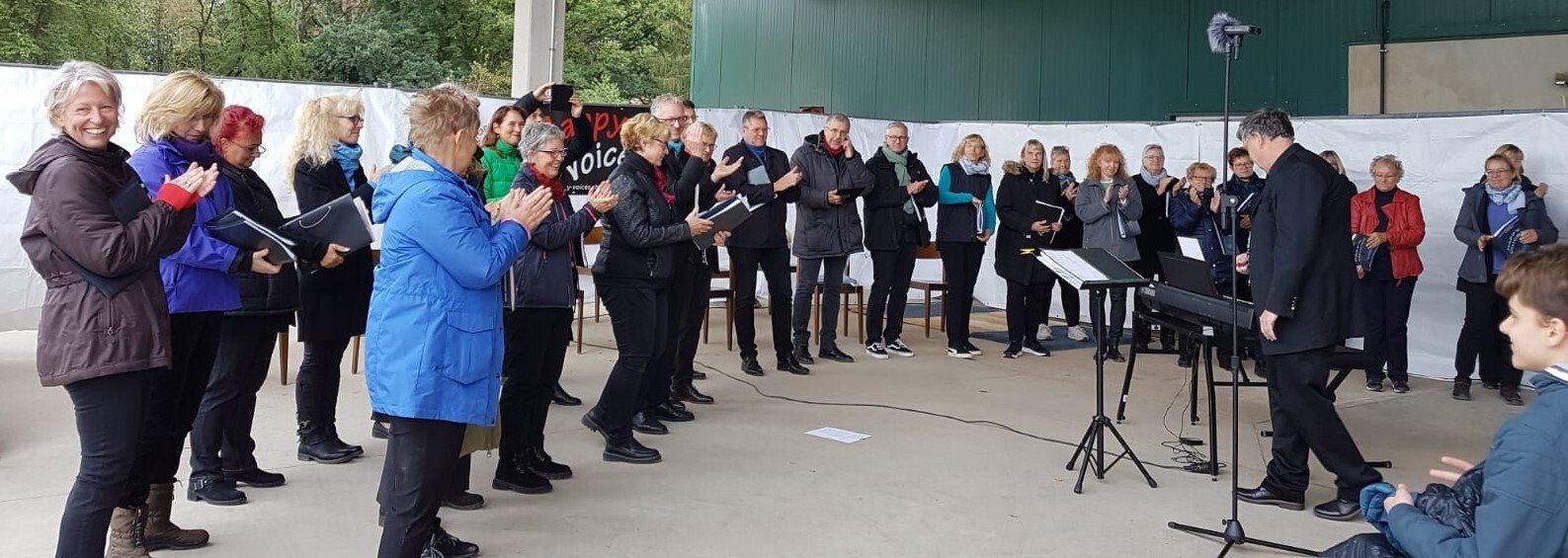 Geboten wurde ein breites Repertoire von „The Muppets“ über „Hallelujah“, „Probier´s mal mit Gemütlichkeit“, bis hin zu „Lord of the Dance“ und vielen weiteren Songs. Unterstützt wurden die Happy Voices durch die Bruchköbeler Band „Red Chair“, die stimmungsvoll zusammen mit dem Chor „Africa“ und „A Million Dreams“ präsentierte, ihrem langjährigen Chorleiter und Vorsitzenden des Hauses der Musik in Steinheim, Michael Schnadt und ihrem ebenfalls langjährigen Pianisten Michael Hittel.